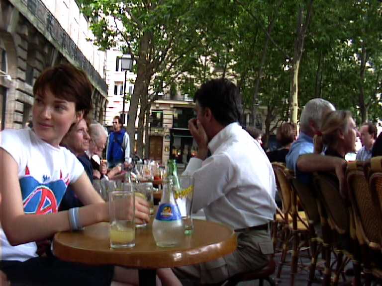 It's a nice day, so I'm at one of the little round tables well out in front of the café, facing the Place St. Sulpice. The part of the church closest to me is covered in scaffolding and construction partitions. The top of the fountain is hidden by trees on the other side of the street. But I can see most of the fountain, and a large part of the church from here. The ground slants up away from the café, so I feel as though I would slide backwards if the ground was at all slick. ![]() There was a Schweppes glass on my table when I sat down, which I thought the waiter would clean off. He didn't, and instead put my bill inside so that it now sits in there, wedged upright. A bit strange, but I guess it allows people to put paper money inside without fear of it blowing away. I don't know. He came to collect the money soon enough anyway. Actually, I guess it's so the bill doesn't get lost or blow away. There is a nice breeze going at the moment. ![]() The wicker chairs outside are chained together in rows. My coffee cup and saucer have floral designs painted on them. The church is striking an incredibly late hour, as though it were 100 o'clock or something. I was given a packet of sugar cubes and just enough espresso to cover the bottom of the cup. |