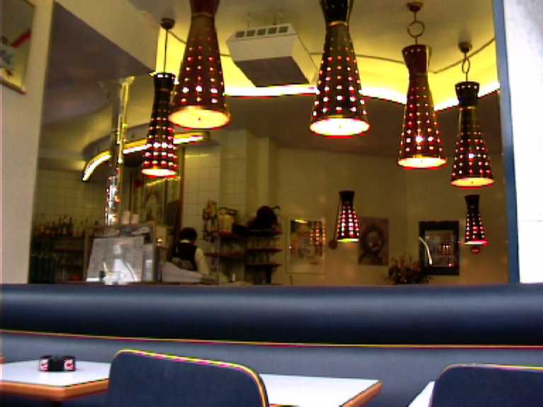 One of the giant metal lights hanging from the ceiling is swinging slightly. It's shaped like a polka-dotted rust-colored evening gown still on the spool with holes where the polka dots should be. Closer to the front of the café is a row of similar lights except fatter and squatter and slightly crumpled, as if they had crashed to the ground at some point and were put back up without getting the dents pounded out first. ![]() The place resembles a diner or an upscale fast food restaurant. The tabletops are bluish asphalt in appearance, and the chair cushions are blue vinyl with a yellow band around the back cushion. There is a variety of ashtrays here; the one on my table is white plastic and has a little picture of a racing car driving straight at me above the word "Roadman," but the bottom half of the word is uniformly missing on each of the four sides. ![]() My espresso came with a packet of sugar cubes and was served to me by a man who is now sweeping out the place, which is relatively empty; a pop soul group of young men is serenading him from the overhead speaker as he goes about his work. Outside, a line of slightly overlapping square white umbrellas offers protection from an increasingly darkening sky. |