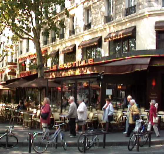 The thick, wood-panelled rectangular column to my left has the words "bar night & day" upon it; above the words a cylindrical lamp is fastened to the column by an L-joint that connects to the bottom of the cylinder. Other cylindrical lights hang from the slightly slanting windows above me. On my right side is another row of windows looking out towards the Fnac and Opera Bastille buildings. Behind me heavy brown curtains hang between me and the entrance to the café. ![]() The place is busy. I'm in a drinking section and there is an eating section on the other side of the entrance. Deeper into the place are more tables, and I think there is an upstairs as well. The chair backs are wooden, more or less half-cylinders that encase thick round seat cushions resting on little bulbous wooden feet. The tabletops are round, composed of slightly varied 3/4" strips of wood laid side by side. The ashtray is clear glass, as is my water glass. My espresso cup and saucer are white, as is the tube of powdered sugar with "S U C R E" written across it in hip, generic lettering. The heaters are turned on inside and outside, though the sun has just emerged from the previously gratuitous cloud cover. A woman struggles by on the sdewalk under the weight of at least two backpacks. She is wincing as if in pain, and her left forearm is completely missing, or maybe it was never there to begin with. When I arrived, there was a long-haired man sitting within earshot, making million dollar business decisions on his cell phone. At one point he said "They told me one thing and now you're telling me something else. What I want to know is where does your loyalty lie?" He punctuates his sentences with expletives that cause a nearby French woman to look at him condescendingly. Or maybe she's just grimacing because of the neck brace she's wearing (which she later removes). She fiddles some with a Palm Pilot, talks to the woman she's with, and then they leave to be replaced by two slightly older French women. People come and go all the time, the café remains busy, and in places the walls, furniture, and floor dance with the sun shining through the moving branches of the trees outside. |
