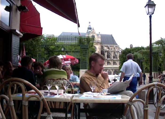 In front of me, across the gardens of Les Halles, is the magnificent St. Eustache church, and the part covered in scaffolding is neatly blocked by green trees and vine-covered arched walkways. I'm sitting outside at a square marble table in a cane wicker chair with a maroon and off-white seat. The weather is cloudy and moderate, nice. Near me a man is wrestling with plastic wrapping, trying to get at a toy he has bought for his young son sitting across from him. ![]() My ashtray is blue and has the image of a camel silhouetted against the moon. My espresso came with a packet of sugar cubes. The boy is telling his father the game cartridge doesn't work, so the man is now examining it and wrestling with the instruction manual. The boy, impatient, wants the thing back and the father says (in French), "Wait, Richard. You asked me to look at it and I'm looking at it." It's some kind of Game Boy thing, and it turns out that it works in a different game Boy than the one they have. Very disappointing. |